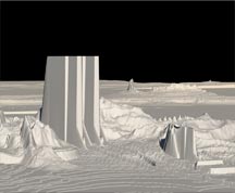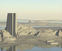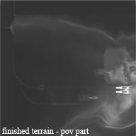 The terragen terrain file was worked out in best quality, 4097x4097. That assured me best accuracy in the render. The editing in photoshop was a very difficult task. Because of the high accuracy, i needed for the render, i had to work pixel by pixel. The most time consuming part was the rendering. For each new addition i had to testrender the landscape. I needed to know if the part looks right, has the right height etc. Since i had each single structure on an own layer it was easy to adjust the height of an object just by adjusting the opacity in ps. Nonetheless a very time consuming procedure. In the end i had more than NINE 5000x3333px renders with surely a week of rendertime. |
